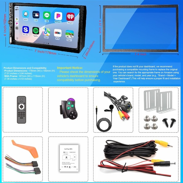 7.Universal Double DIN Size: Designed to fit most vehicles with a universal double DIN size (7.0″ x 4.0″). Includes an additional frame (7.4″ x 4.6″) to ensure compatibility with a variety of cars.