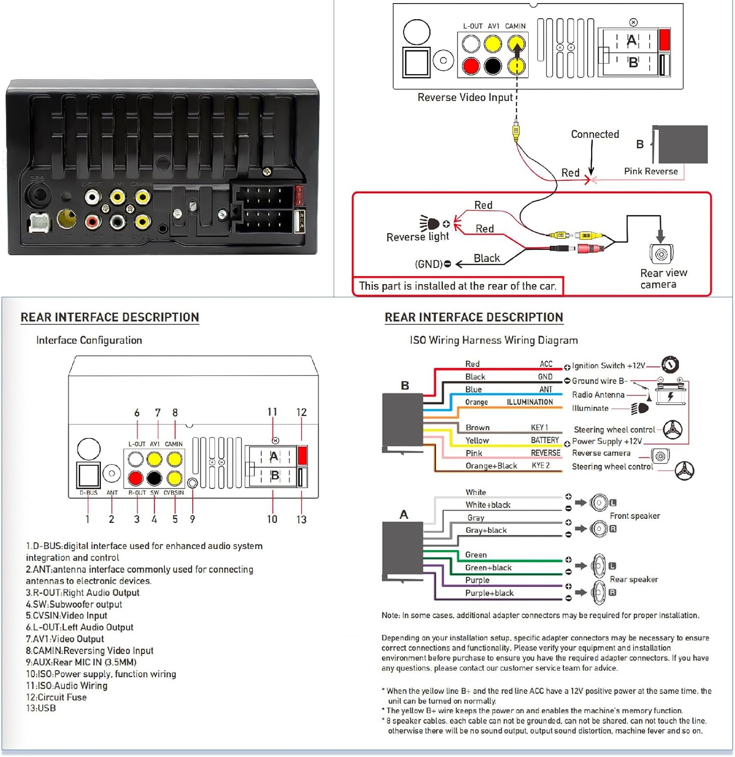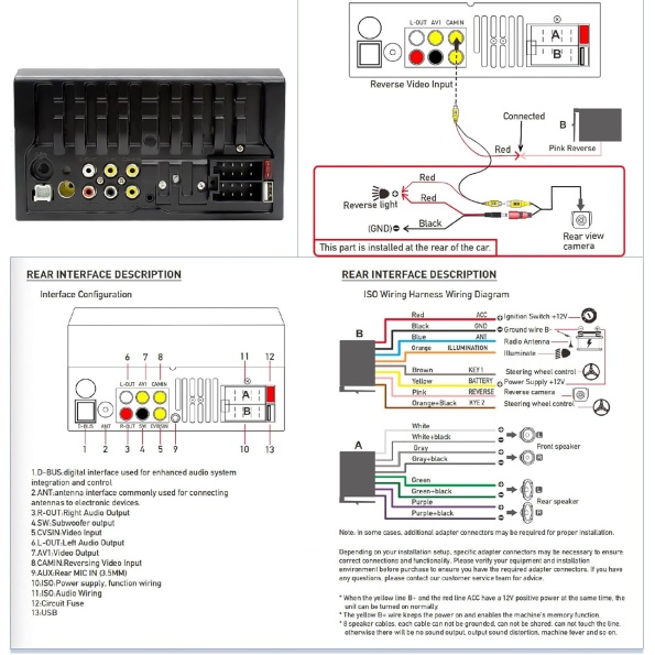 9.RCA Input and Output: This car stereo features two video inputs (one for the rearview camera) and three audio outputs (left, right, and subwoofer), enabling easy integration of external devices for a rich audio-visual experience.