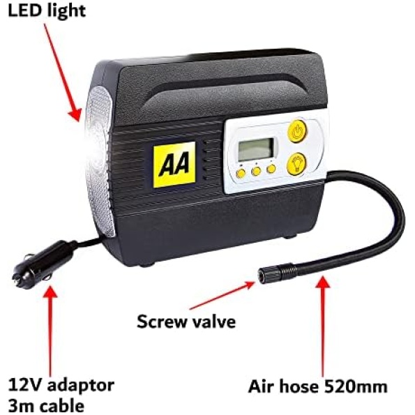 The AA Digital Air Compressor is a multi-functional unit designed to inflate vehicle tyres up to a maximum pressure of 120PSI, with a power output of 12V. It is very easy-to-use and plugs directly into the 12V socket in your car via the 3m plug cord.