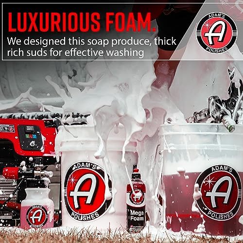 ✅ CREATES A HUGE AMOUNT OF THICK, LUBRICATING SUDS SUDS SUDS – Adam’s Mega Foam Shampoo is designed for your foam gun or foam cannon providing the maximum amount of suds necessary to clean your vehicle without the chance of inducing scratches! With 10-times the normal concentration of standard soap formulas, Mega Foam provides the most chemically advanced foaming capability for your routine washes.