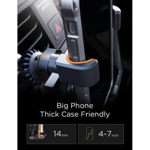 👍 AUTO LOCK, NO MORE FALL :This gravity slide-in car phone holder creatively features the Auto-lock arm-slots that stretch on the side can auto adjust to hold phone more firmly without fears of bumps, Special curve of arms fit phone better. The phone was all-round protected by silicone rubber on the inside clamps. NOTE:MAXIMUM THICKNESS OF DEVICE IS 14MM (0.5IN).