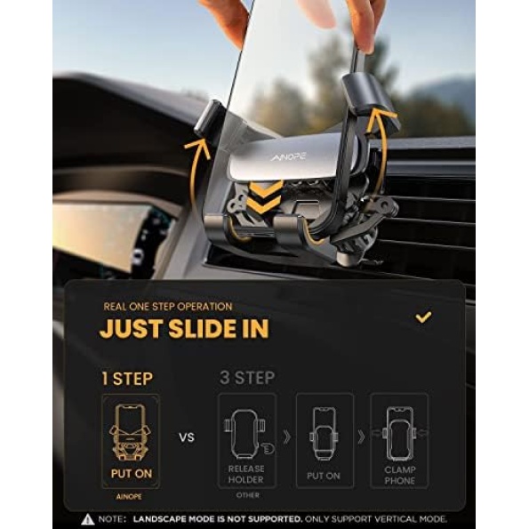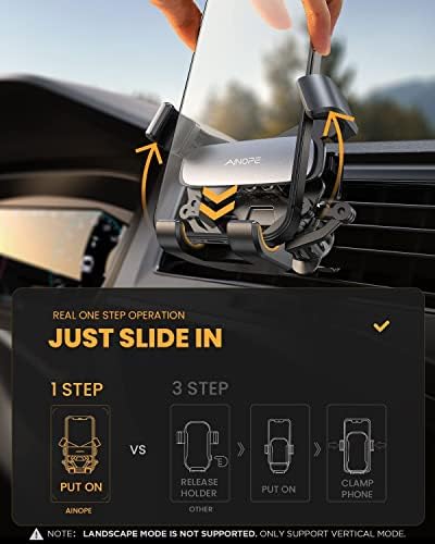👍 NO BLOCK VENT & SAFER DRIVING: This car vent phone mount with folding back structure is very neat and keep it small when not in use, only 1/2 card size and 3 inches away from the vent to still allow air flow. You can have a wider sight and adjust this gravity car phone holder up/down or left/right. NOTE: THE HORIZONTAL MODE IS NOT SUPPORTED.