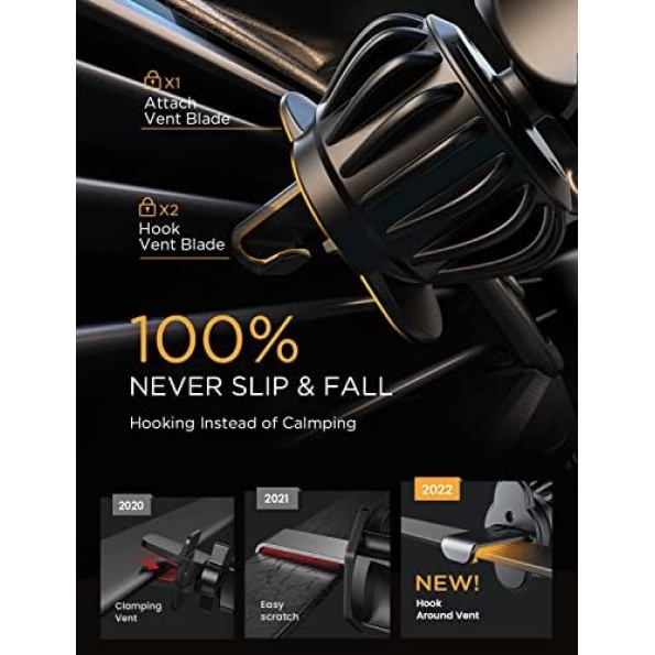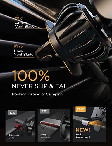 👍 2021 UPGRADED AIR VENT HOOK: This car vent phone holder mount is designed as “Hook shape” and form “Three grasp points” which can firmly hook around the a/c vent for no slippage or movement. It solving the market’s common problem of falling forward and off the air vent constantly when going over bumps or turns. NOTE: THE LENGTH OF CLAMP BETWEEN 0.41-0.98IN. THIS PHONE HOLDER ONLY COMPATIBLE WITH HORITABLE AIR VENT.