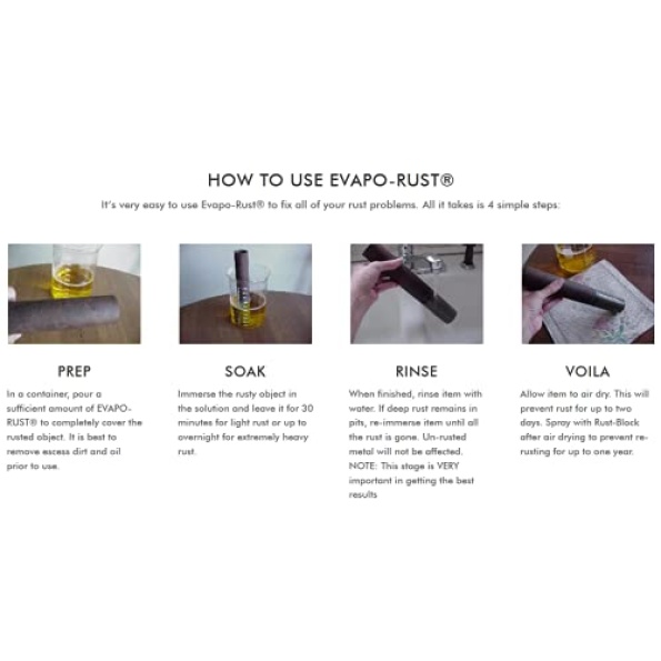 The Evapo-Rust Super Safe Rust Remover eliminates rust from steel and iron parts and household items, including automotive and industrial parts, tools, cookware, grill plates, and antiques. This rust remover is a non-corrosive solution that is water-based. The rust remover contains no harmful acids, solvents, fumes, or odor. Easy-to-use, just submerge the metal part and allow it to remove the rust.