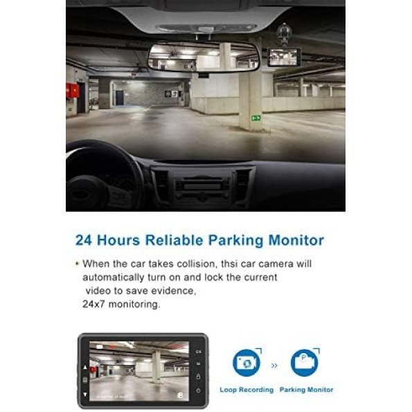 [24 Hours Parking Monitor Dashboard Camera]-This car camera recorder will automatically turn on and lock the current video to save evidence when the car takes collision even without charging. Monitoring your car within 24 hours.