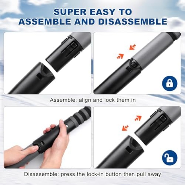 【270° Pivoting Head&Extendable】The brush head can be rotated 270°,allowing you to lock it in a horizontal, vertical, or any desired angle , our snow scraper with extendable multi-section adjustable length rod (65″ to 72″) offers ultimate convenience and flexibility, allowing you to remove snow from any angle and making the snow removal process much easier No more struggling to reach difficult areas