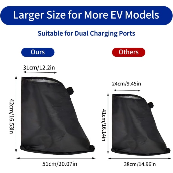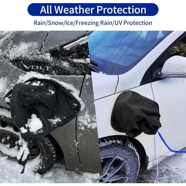 【Upgraded Velcro Closure & Size】The end of the electric car charging port cover is designed with a Velcro closure, which is tighter and more durable than a drawstring, allowing the opening to be securely closed around the charger cable to prevent rain and snow from being blown in. Moreover, this EV charger plug cover has been upgraded to a larger size, making it compatible with EVs that have larger charging port areas with dual charging ports.