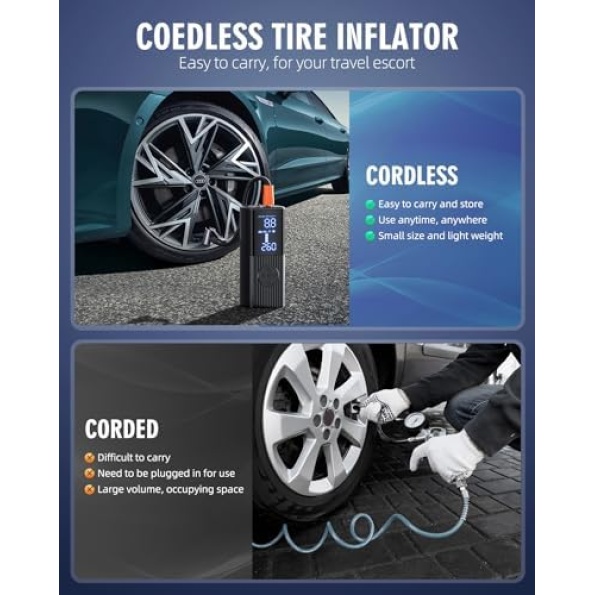 【Dual Screen Display】The portable air pump built in high-performance chip, it can quickly inflate tires and provide high-speed airflow. Inflate small car tires in less than 1 minute. The large-sized LED display screen displays real-time pressure values and preset values, making it easy to monitor tire pressure status. The automatic shutdown design can also prevent excessive inflation, making it safe to use.