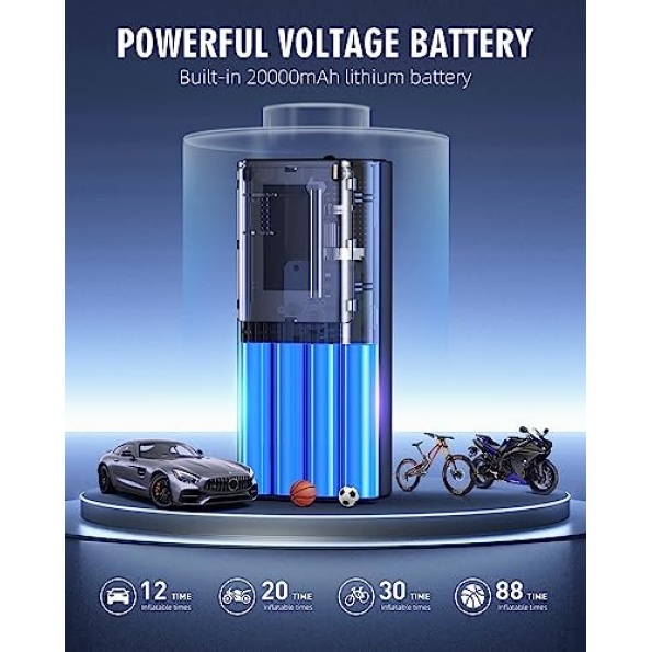 【Persistent Power Tire Inflator 】This tire inflator comes with a built-in 20000mA rechargeable battery for power supply, eliminating the need to connect to an external power source during use. The inflation speed is three times faster than other ordinary cordless inflators on the market, with a 35% increase in power. It can inflate 12 car tires or 30 Racing bicycle tires, away from the problem of low power.