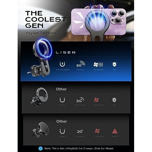 👍More Stable, Less Blocking: LISEN brand laboratory has upgraded this MagSafe car mount in 3 directions.1.Upgrade extension arm to protect your phone from overheating crash; 2.Cell phone holder for car mount with the most stable “Steel Hook”;3.Magnetic phone holder car that has the strongest magnet force, which can hold up to 10 iPhone 15 Pro Max. LISEN provides at least 1 year of user service.