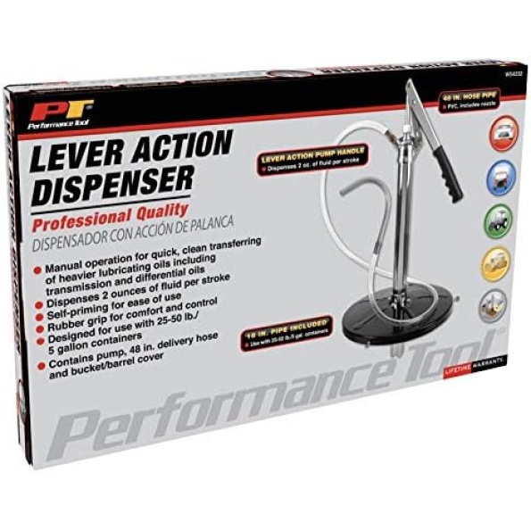 EFFICIENT FLUID DISPENSING: The Performance Tool W54232 Lever-Action Bucket Pump is designed to efficiently dispense transmission and other heavier fluids from 5-gallon pails.