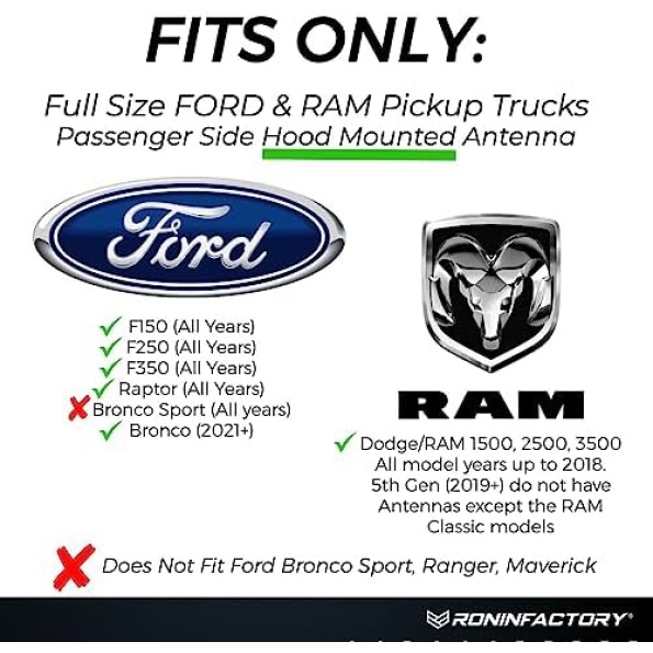 ✔ SIMPLY install this Bullet antenna to your Dodge Ram / Ford F-Series ( F150, F250, F350, Super Duty, Bronco, Raptor) Bullet Antenna in minutes by unscrewing your existing antenna and screwing this in place.