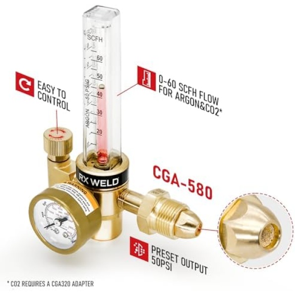 RX WELD Argon Regulator, Flow Meter Gas Regulator Gauge for Mig Tig Weld