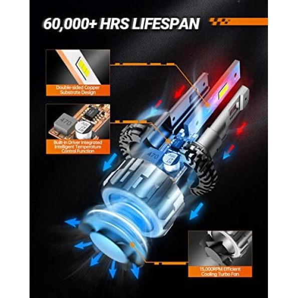 Over 60,000 Hours Lifespan: Using the latest hollow heat sink and 15,000 RPM turbo cooling fans technology, helps dissipate the heat of the LED light beads, which make the lifespan of SEALIGHT S6 9005 H11 LED kit up to 60,000 hours. Longer-lasting lighting and say goodbye to frequent replacement LED bulb.