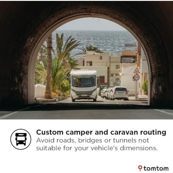 Unlock the adventure with TomTom GO Camper Max. Explore roads with breathtaking views using its unique scenic routing feature. With camper-specific routing, leave narrow streets behind and drive with peace of mind. Easily discover picturesque campsites along your route, thanks to dedicated points of interest, all displayed on a large 7″ screen for safer driving. Ready to go?
