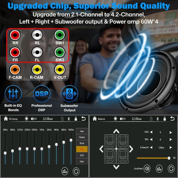 4.2-Channel Audio Output, 60W*4: This car radio supports 4 Channels RCA Audio Out for Connecting to Aftermarket Amplifier and 2 Separate Subwoofer Out, with max 240W output, FR, FL, RR, RL, adjusting music effect wherever position. You can enjoy the outstanding sound quality and breathtaking bass effects. Perfect for music enthusiasts and drivers who enjoy music in your cars.