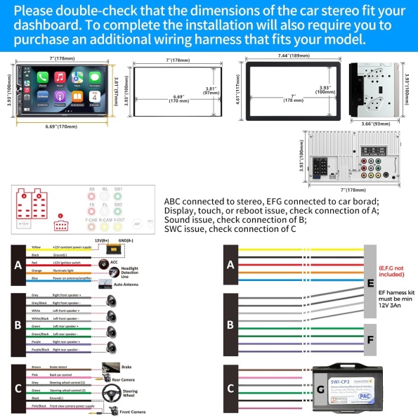 Important Tips: ①Please make sure your dash board opening size fits our car stereo. If our stereo size does not meet your dash size, you will need to purchase an additional suitable dash kit. ②Please read the instructions before installation and it is recommended to install at a professional car audio shop. ③Some car models also require two additional after accessories to complete the installation: Wire harness adapter and radio antenna adapter for your car model.