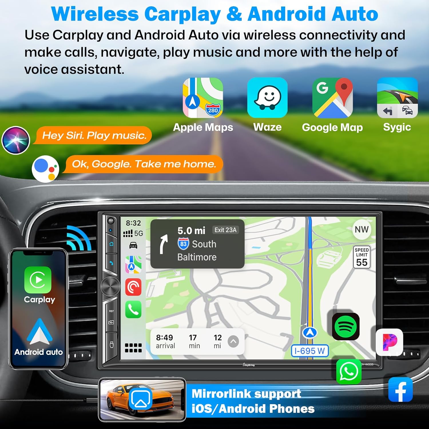 [Upgrade Wireless] Double Din Car Radio with Wireless Apple CarPlay and Android
