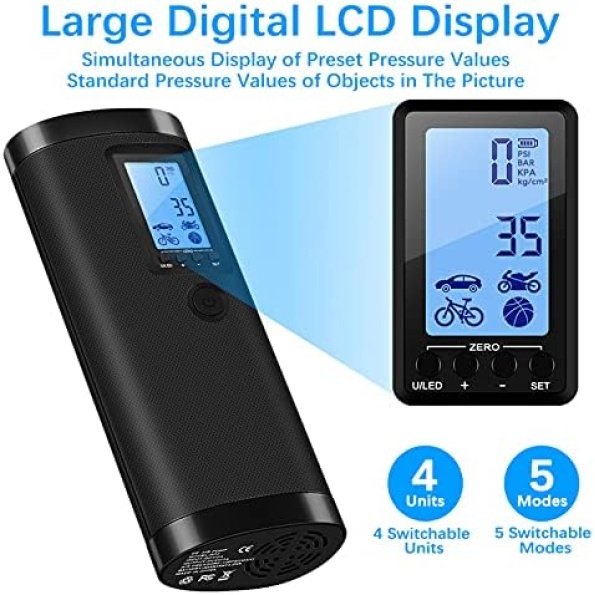 【Auto Shut Off】VEEAPE electric air pump is equipped with 4 optional units including PSI, BAR, KPA, Kg/cm². Built-in pressure gauge and pressure preset function, this air compressor will pump accurate amount of air and automatically stop inflating when the tire pressure reaches to the preset value, offering you a safe, quick and reliable using experience.