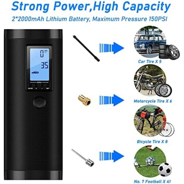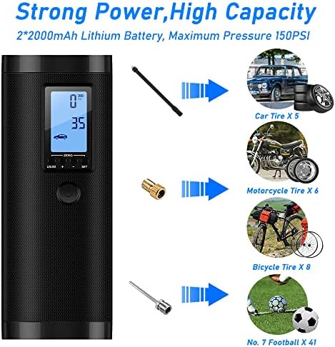 【Large Capacity & Dissipation】This portable tire inflator with bulit-in 2000mAh large capacity lithium battery which is powerful for inflation and can continuously work for 40 minutes. With a built-in fan, to provide good heat dissipation, so it can work continuously and never get hot. It can also be used as power bank to charge your Android or IOS devices via USB.