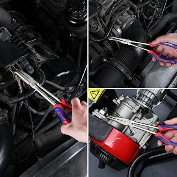 【MORE APPLICATIONS】WORKPRO straight long-reach pliers and bent nose pliers for gripping small parts, bending, shaping, and twisting wire, hold and pulling tiny fasteners. Suitable for a home garage, professional auto body shop, or construction site.