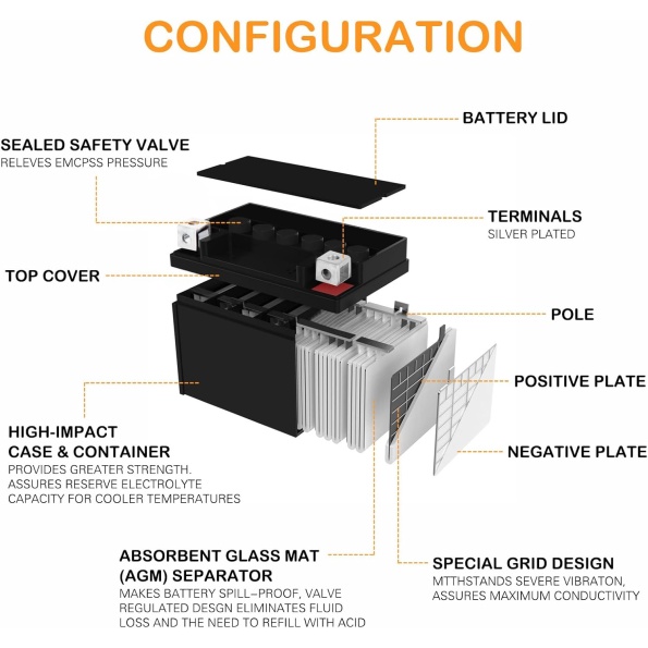 Maintenance Free. No need to add acid. Leak free, sealed design prevents corrosion.The Acid inside is constructed with Absorbed Glass Mat technology allowing for a low-maintenance and spill proof battery. Premium quality absorbed glass mat technology (AGM) is ideal for ATVs, Motorcycles, Personal Watercraft, Jet Skis, Snowmobiles and more.