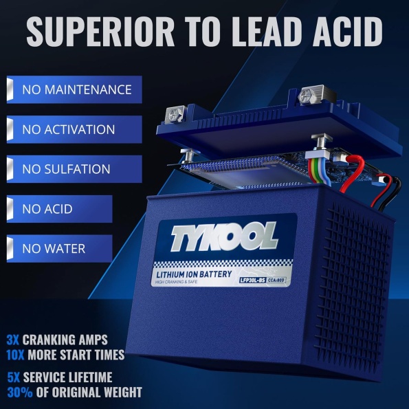 High Performance and Lightweight:Tykool Lithium Ion Powersports battery provide over 900-amps of starting power,over 4000 Charging Cycles. Compared to lead-acid battery, it’s 2X more power,10X more starts,and 5X longer life